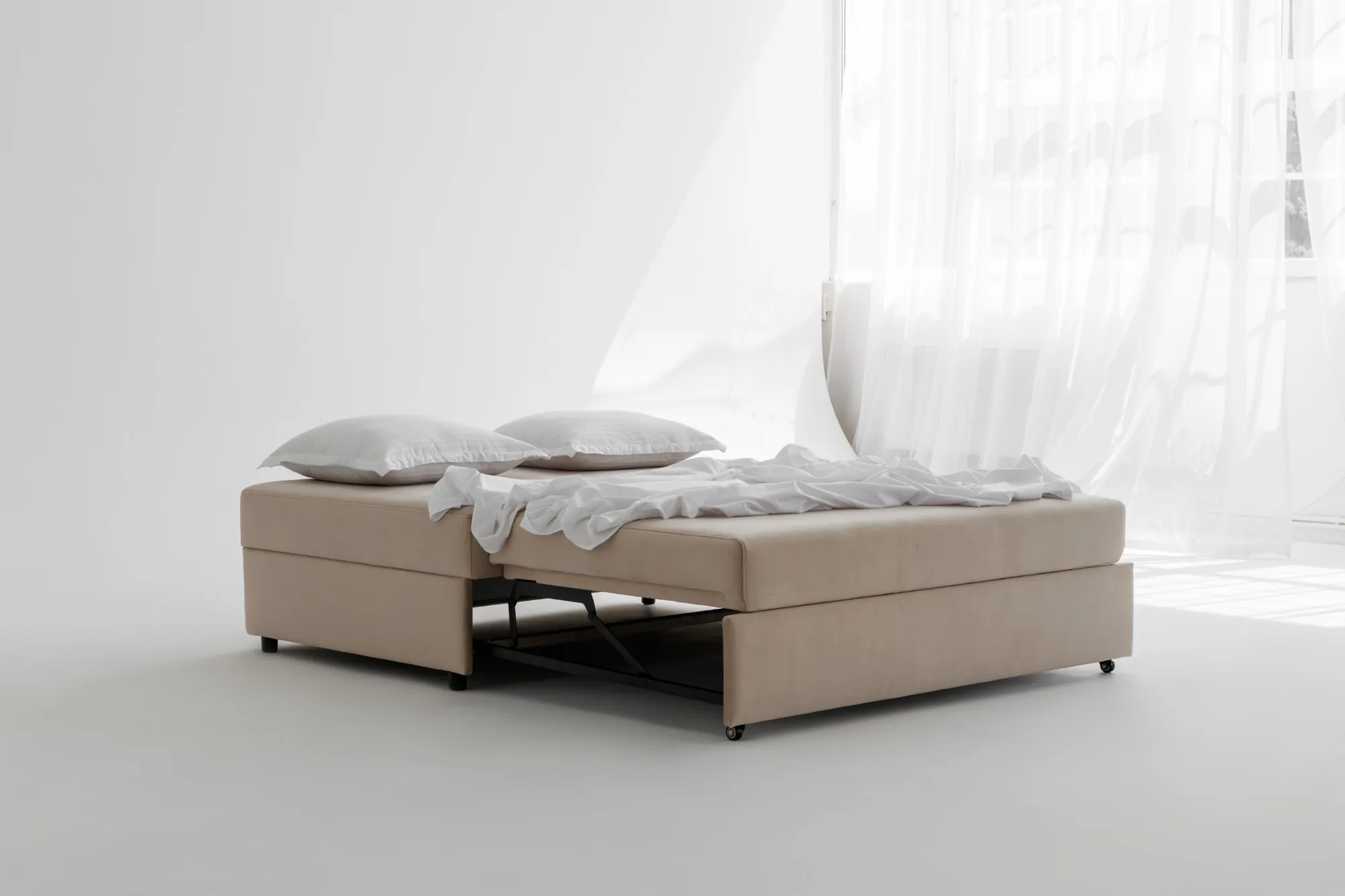 • Mecanismul de extindere permite transformarea rapidă într-un pat spațios (205×152 cm).