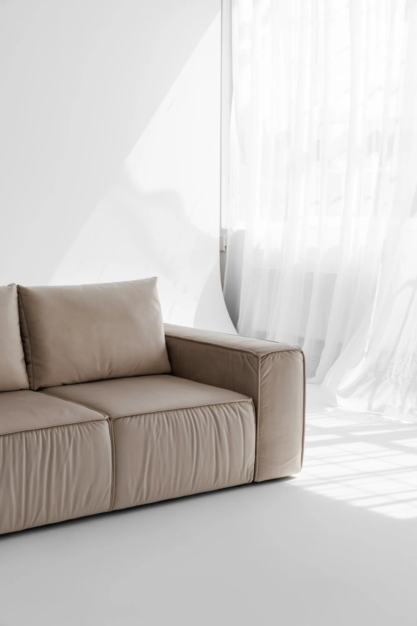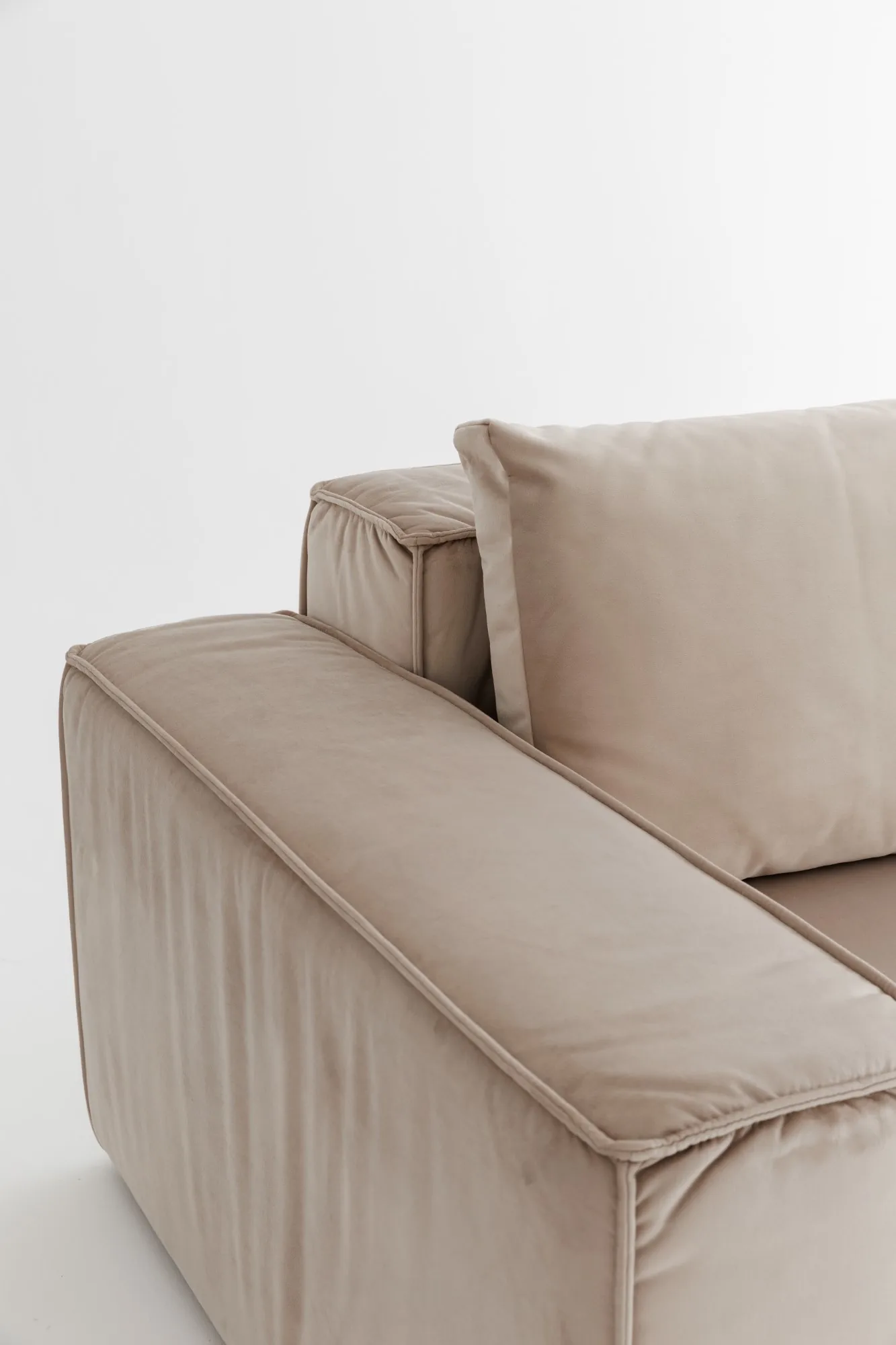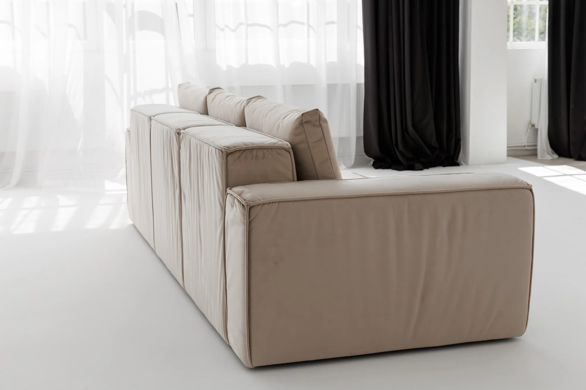 Диван MODUS PUMA от DIVANI — это мощное сочетание архитектурной строгости и домашнего уюта. Он притягивает взгляд своими чёткими формами, выразительной объемной посадкой и стильной велюровой обивкой цвета крем.