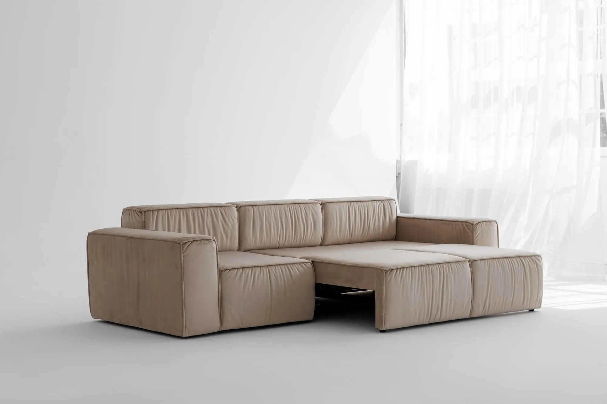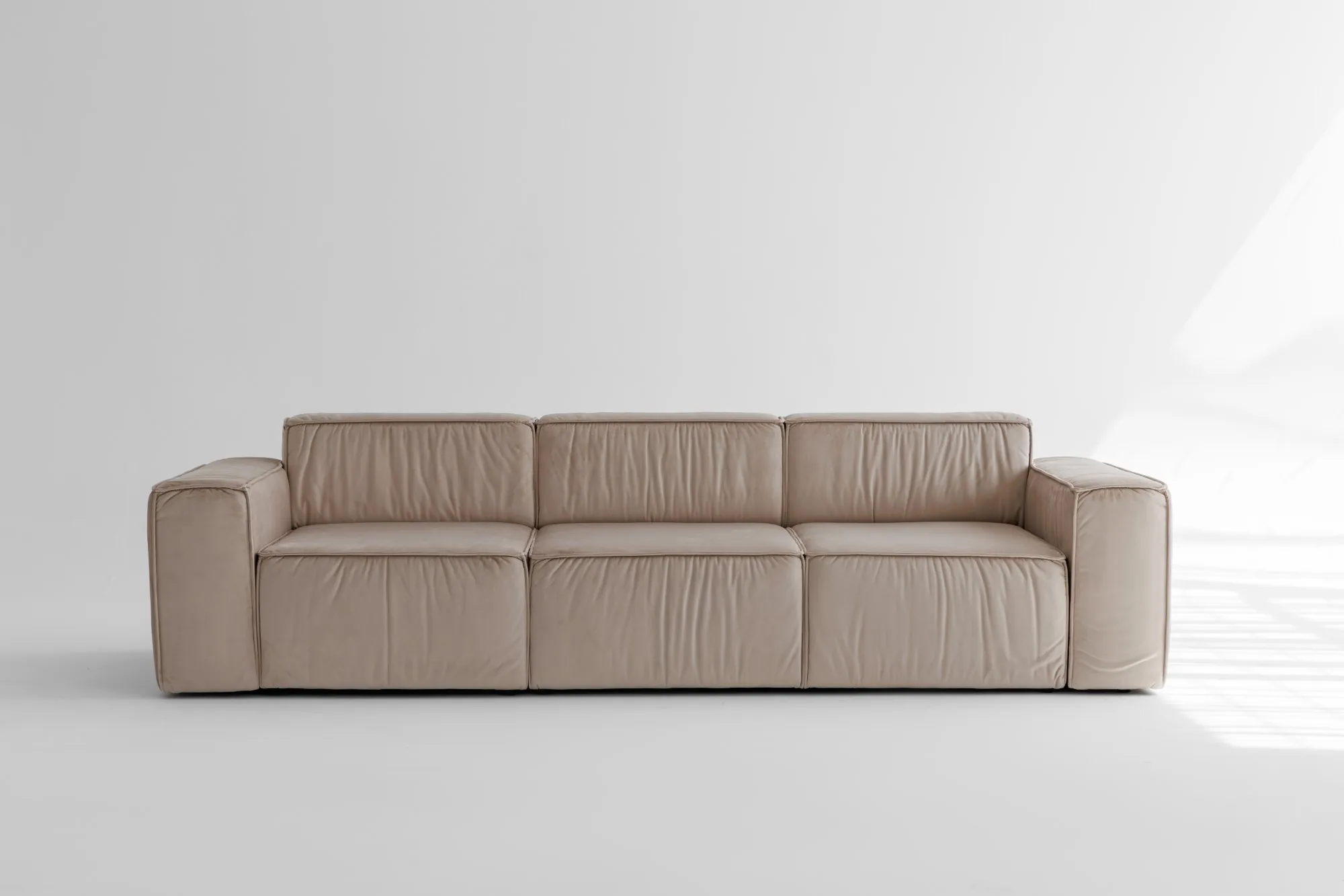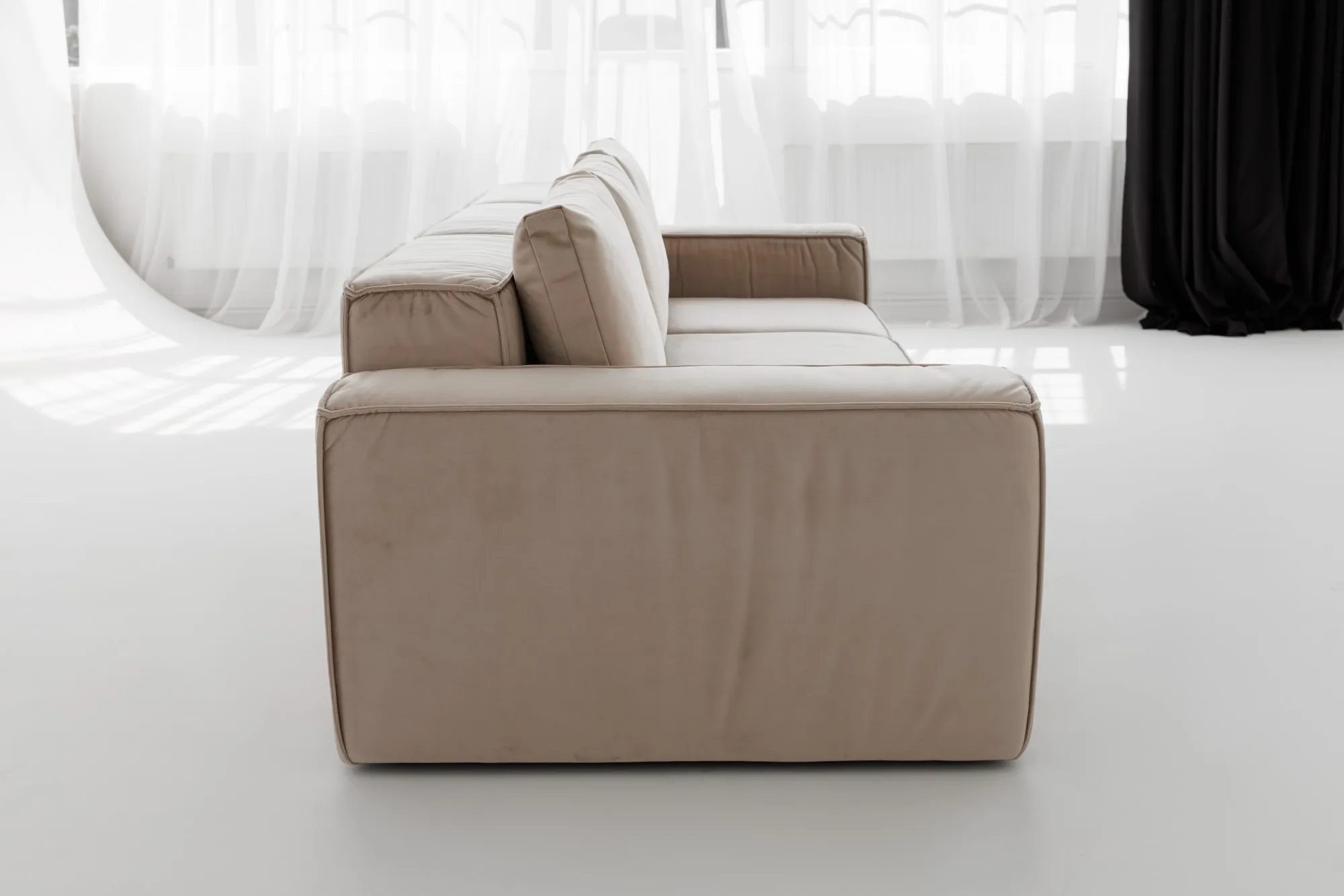 Диван MODUS PUMA от DIVANI — это мощное сочетание архитектурной строгости и домашнего уюта. Он притягивает взгляд своими чёткими формами, выразительной объемной посадкой и стильной велюровой обивкой цвета крем.